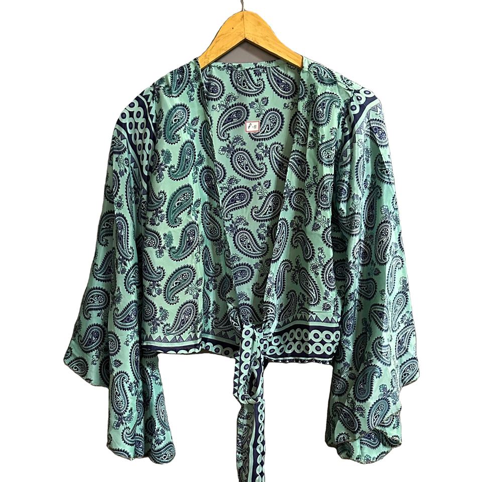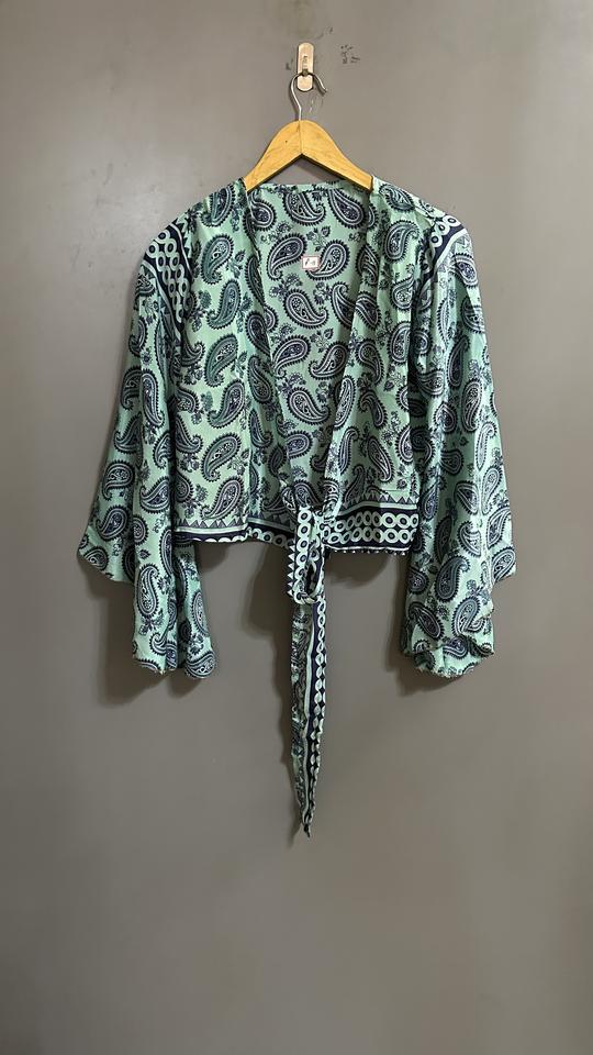 Elegant Women's Pure Silk Floral Crop Top with Deep V and Long Bell Sleeves Casual Summer Wear Hot Sale Tie Wrap Top