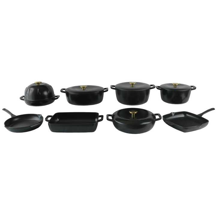 Offre Spéciale : Batterie de cuisine en fonte émaillée, disponible en plusieurs couleurs, comprenant des casseroles, des moules à pain, des poêles peu profondes, des poêles à frire et à griller, ainsi que des plats à rôtir.