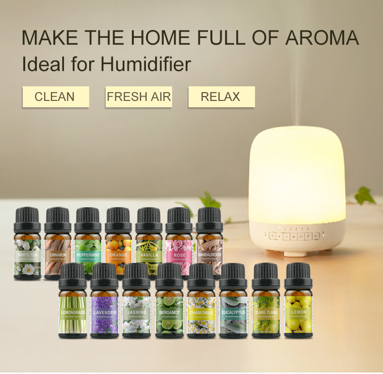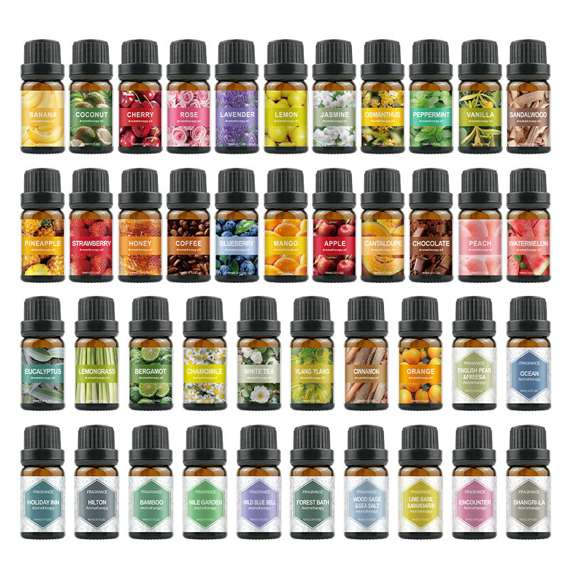 Rose, Romarin, Arbre de thé, Eucalyptus, Lavande, Citron, Orange, Jasmin, Camomille, Encens, Bergamote , Santal, Menthe poivrée, Cannelle, Ylang-ylang, Citronnelle