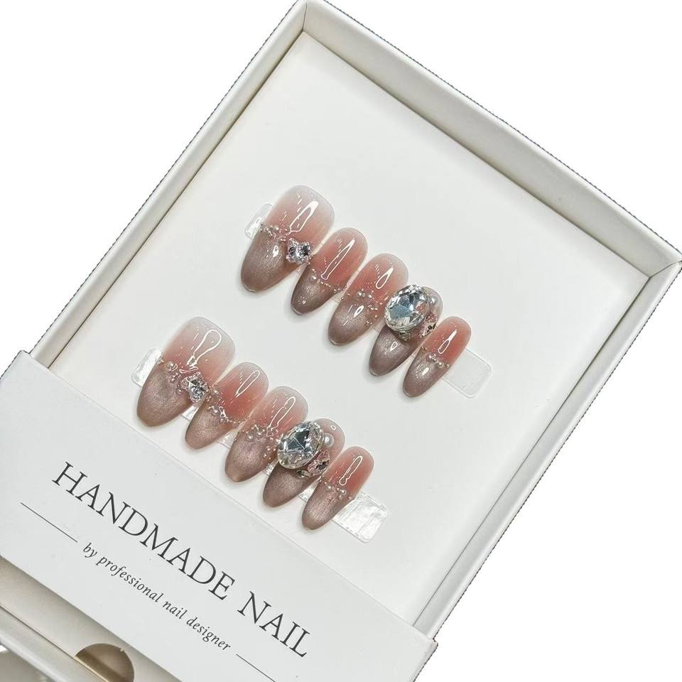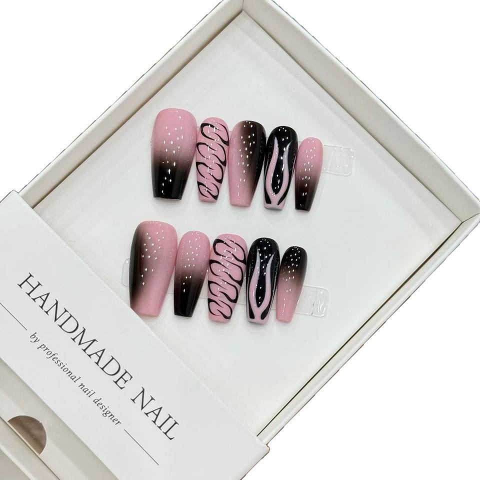 Hot Sale Hand-Painted Pink Black False Nails 10 Piece Flame Sweet-Cool Middle Coffin Artificial Fingernails
