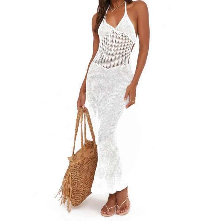 Robe longue en crochet à col halter de haute qualité pour femme, idéale pour les vacances d'été, avec lien à nouer dans le dos, parfaite pour la plage - Grande Vente