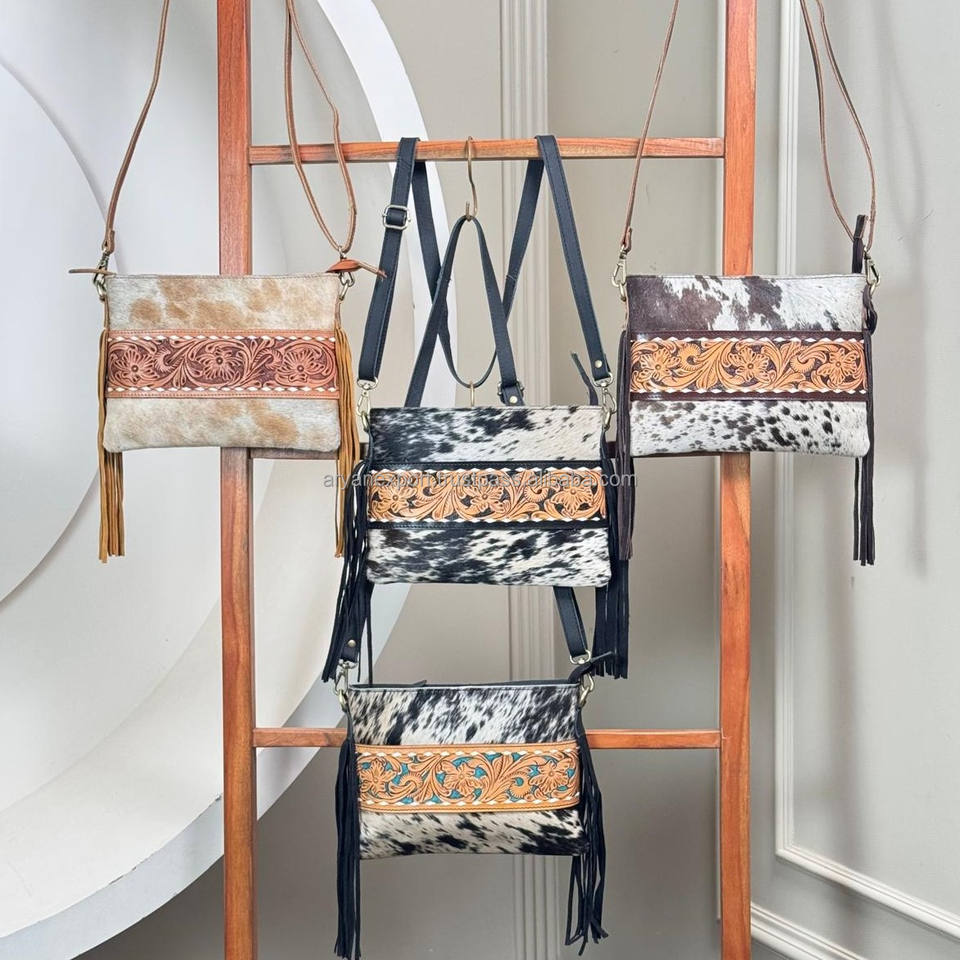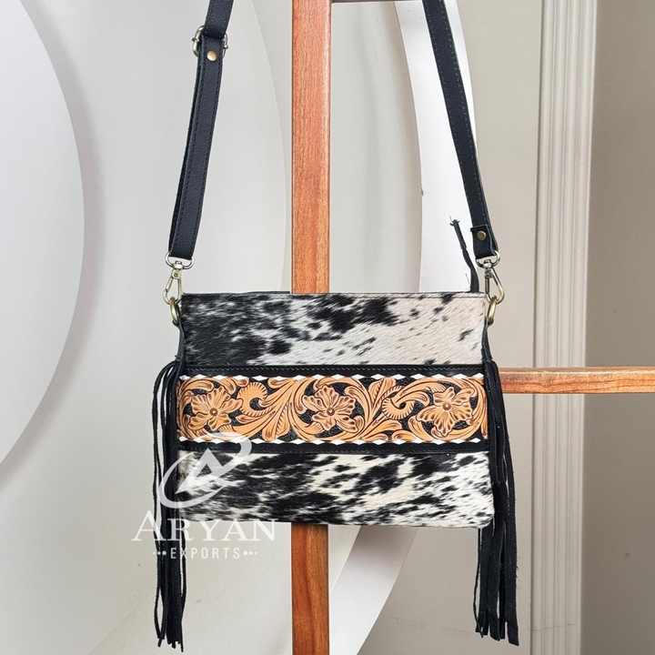 Hand Tooled Cowhide Leather Fringe Crossbody Bag