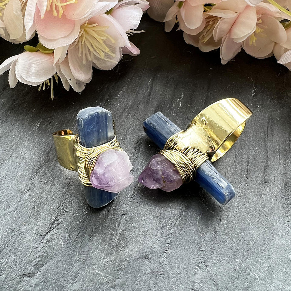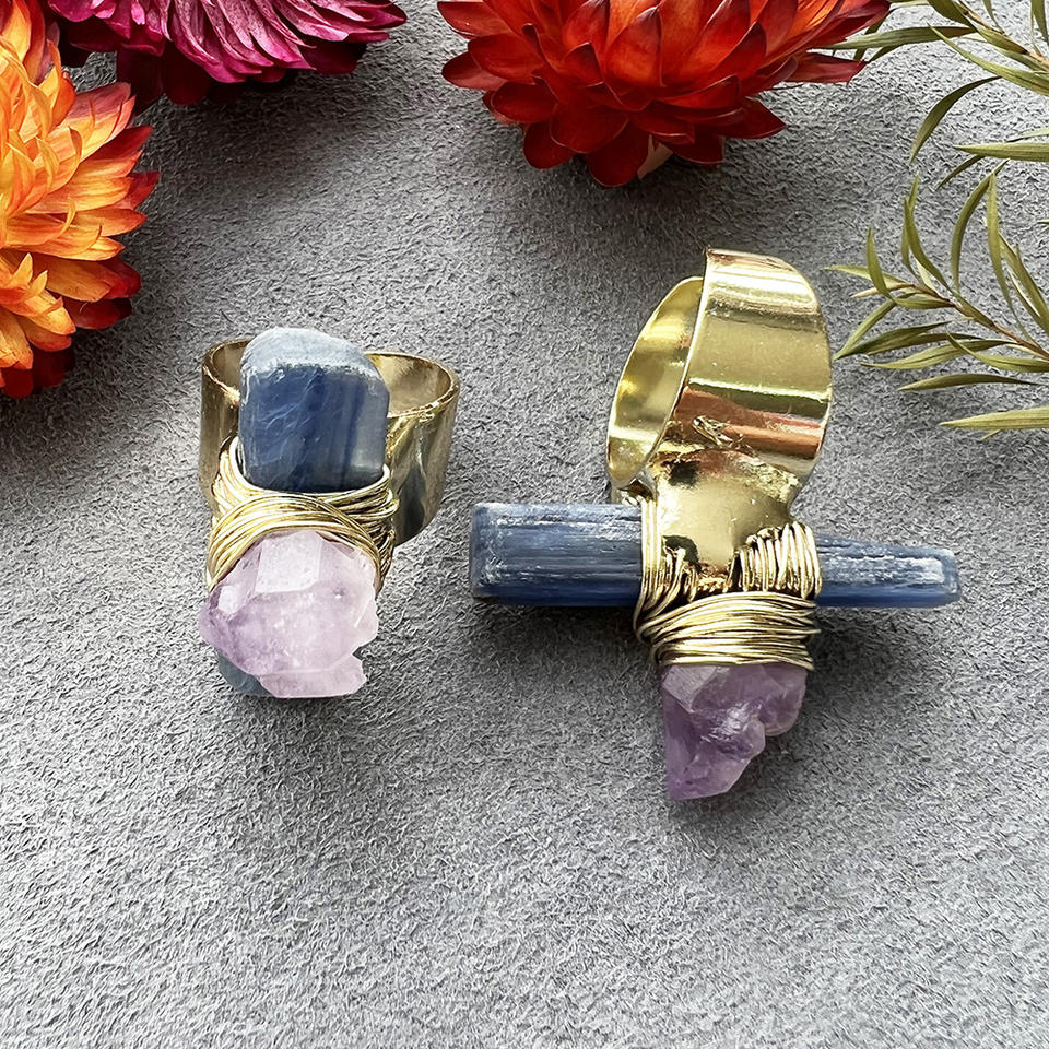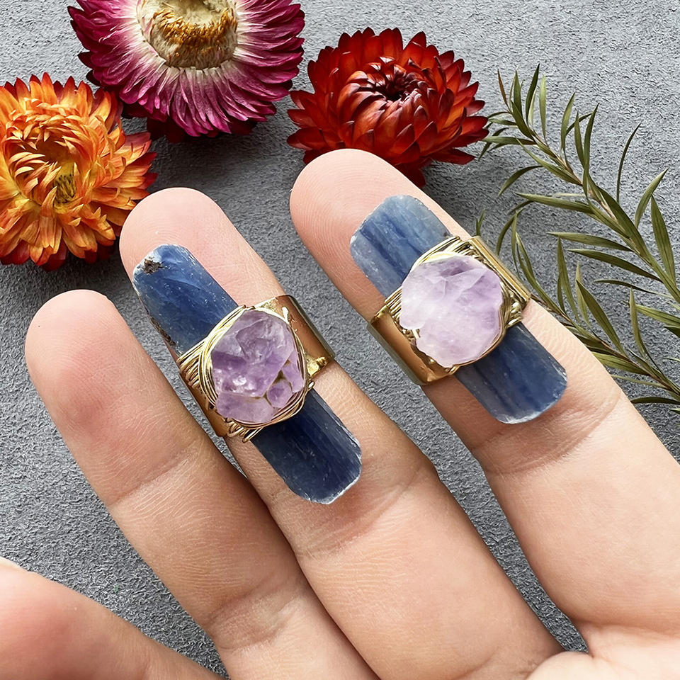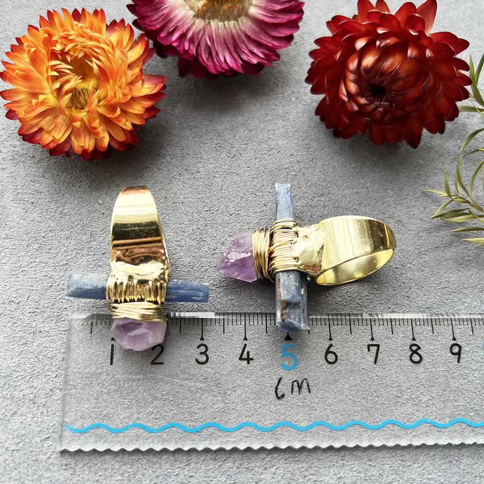 Vente flash Bague en pierre de cyanite bleue Hip Hop plaquée or Améthyste brute Cristal bleu Pierre précieuse Cyanite Bague réglable pour homme et femme