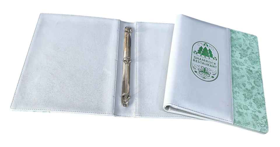 Description:leatherette menu folder with nickel plated logo