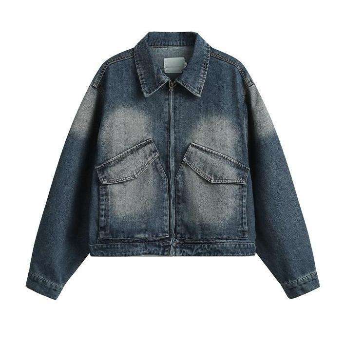 Hot Sale Men's Vintage Washed Denim Jacket Distressed Design Turn Collar Pocket Loose Fit Plus Size for Autumn Spring Winter