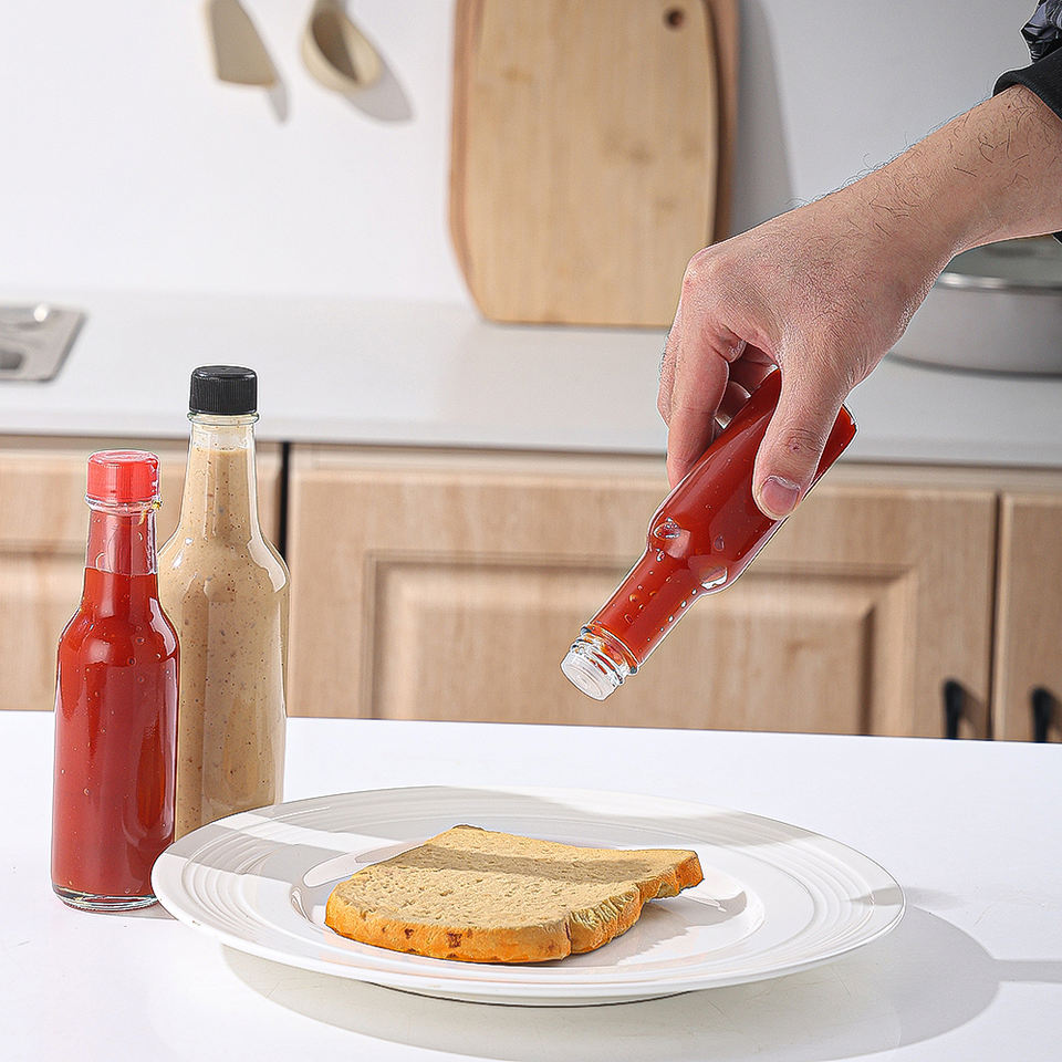 Mini bouteilles de sauce chili vides Offre Spéciale capacité de 100ml 150ml 250ml forme plate avec bouchon à vis en plastique sauce chaude tomate Tabasco