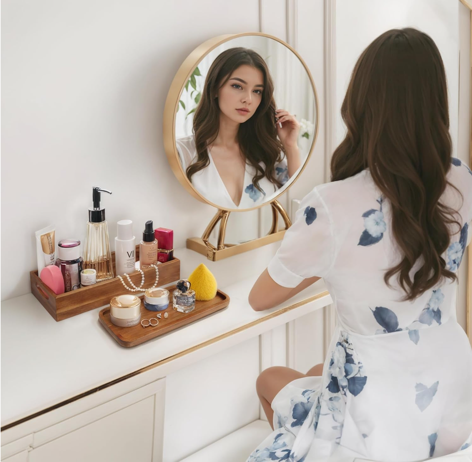 Vente chaude : Ensemble de rangement à deux niveaux en bois d'acacia naturel, fait main, moderne, pour salon et coiffeuse, pour le rangement à domicile