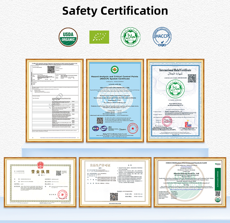 Certificat:HACCP, ISO22000, HALAL, NOP & Biologique UE