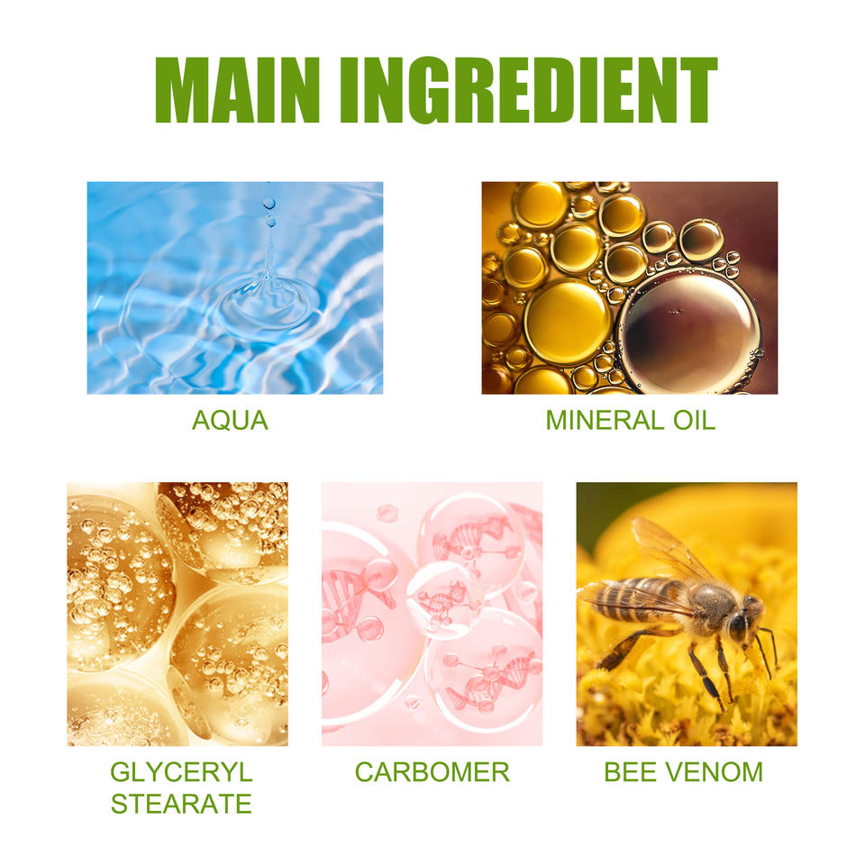 Ingrédients:Aqua, huile minérale, stéarate de glycéryle, Carbomer, venin d'abeille