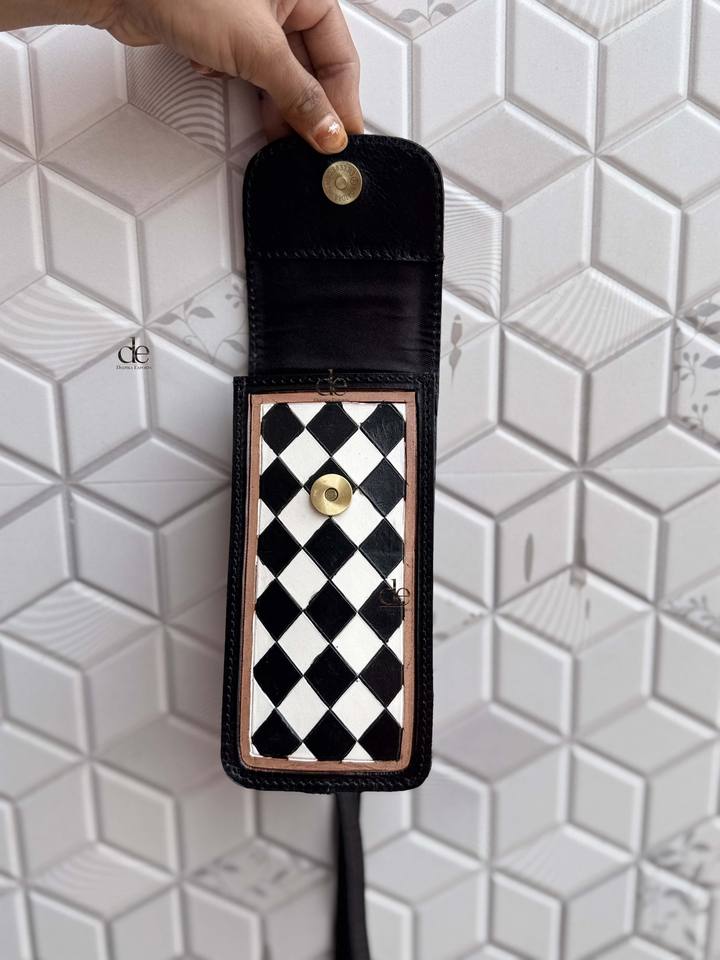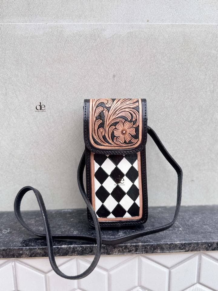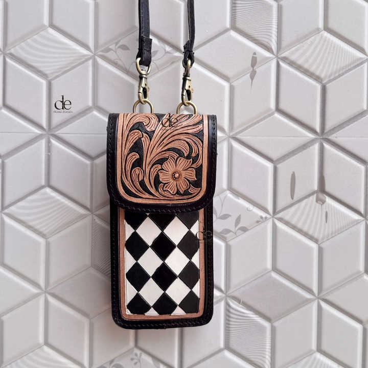 Sac à main pour téléphone en cuir sculpté à la main, motif damier, petite taille, pochette unique de créateur, sac bandoulière tendance