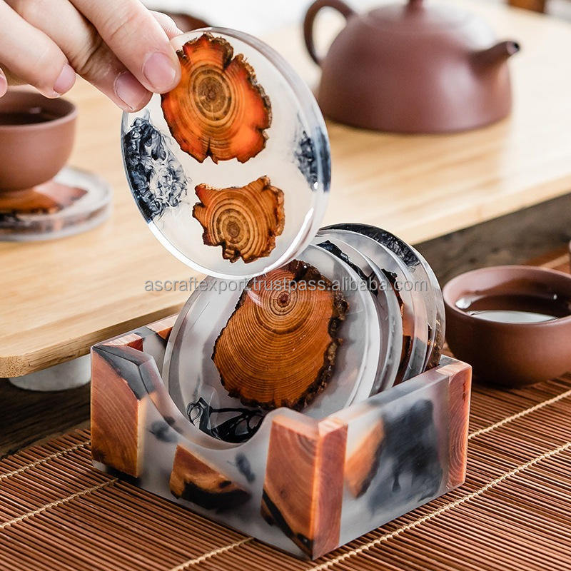 Vente flash : Ensemble de sous-verres en bois et résine avec support, design carré et rond, sous-verres à thé en résine à motifs naturels, faits à la main