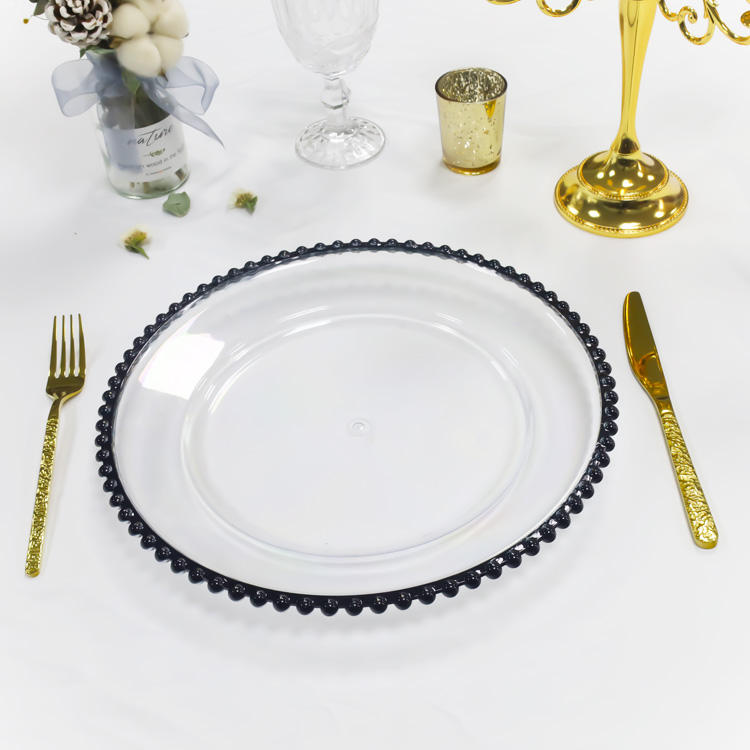 Offre Spéciale Décoration de Mariage, Assiette de Présentation Ronde en Plastique Transparent à Bord Doré de 33 cm avec Perles Or, Argent et Noires