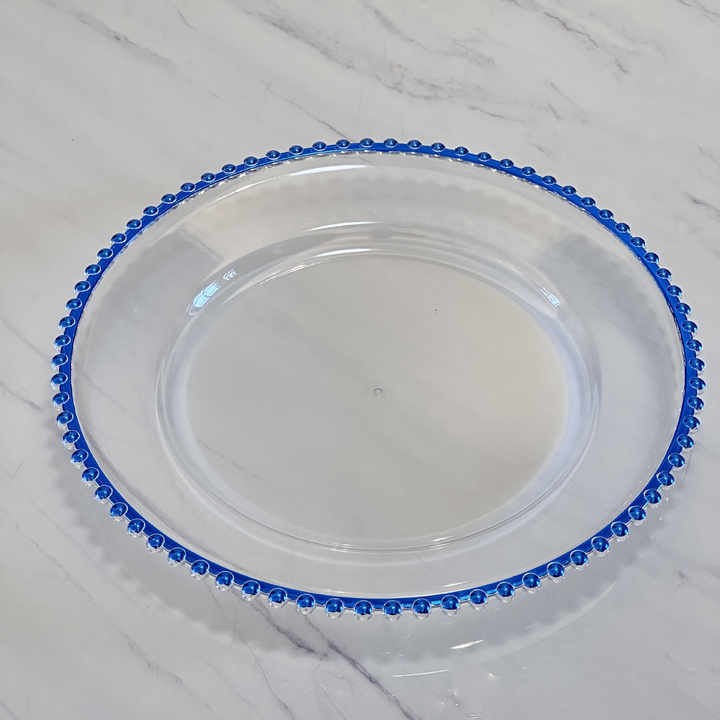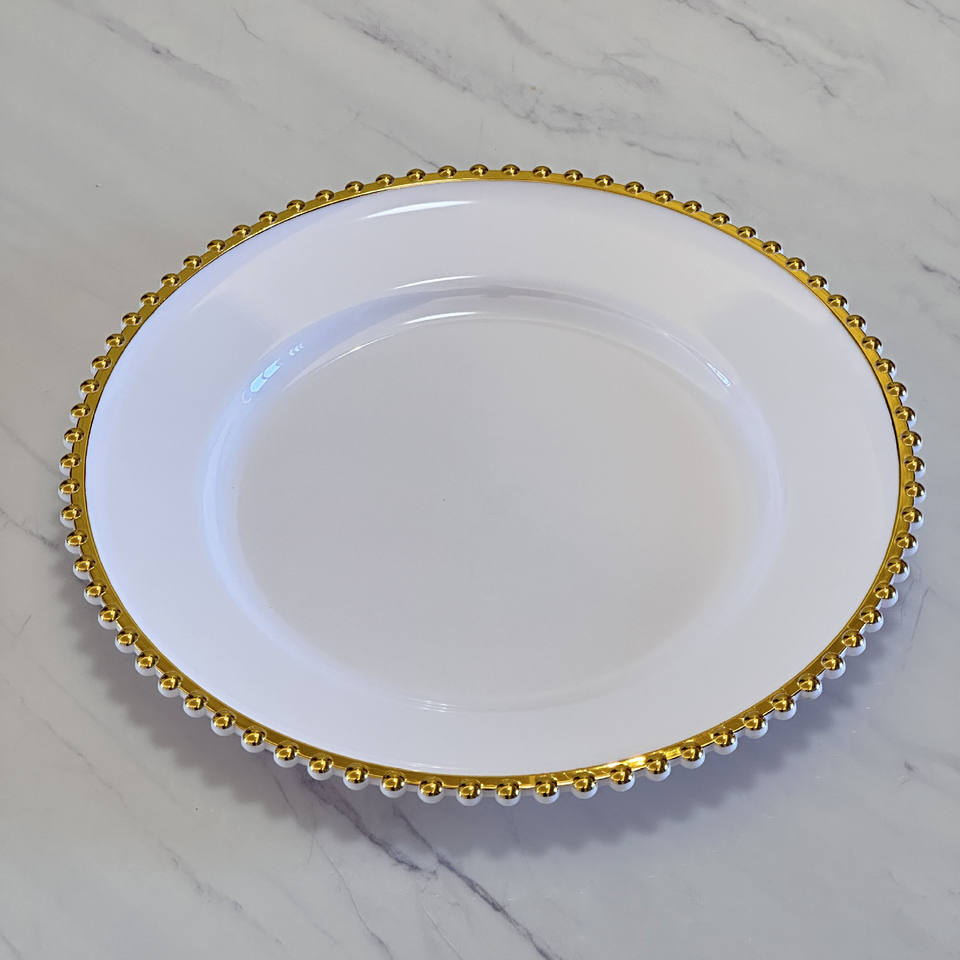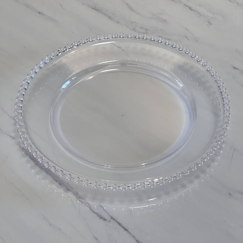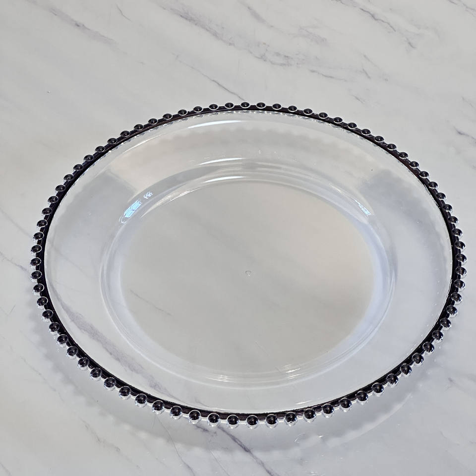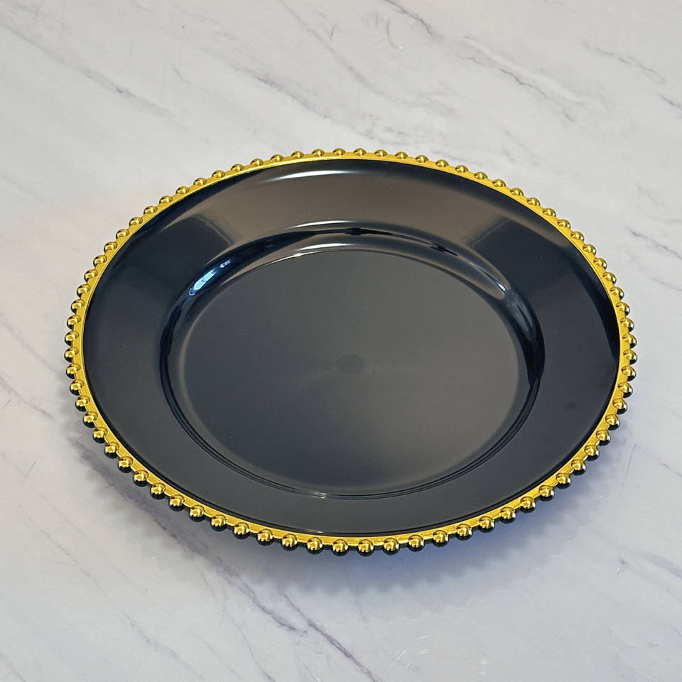 Vente flash Décoration de mariage Assiette de présentation ronde en plastique transparente de 13 pouces avec bord doré et perles dorées, argentées ou noires