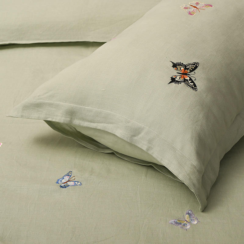Parure de lit motif papillon en promotion – 4 pièces en lin lavé avec broderie lourde pour la maison