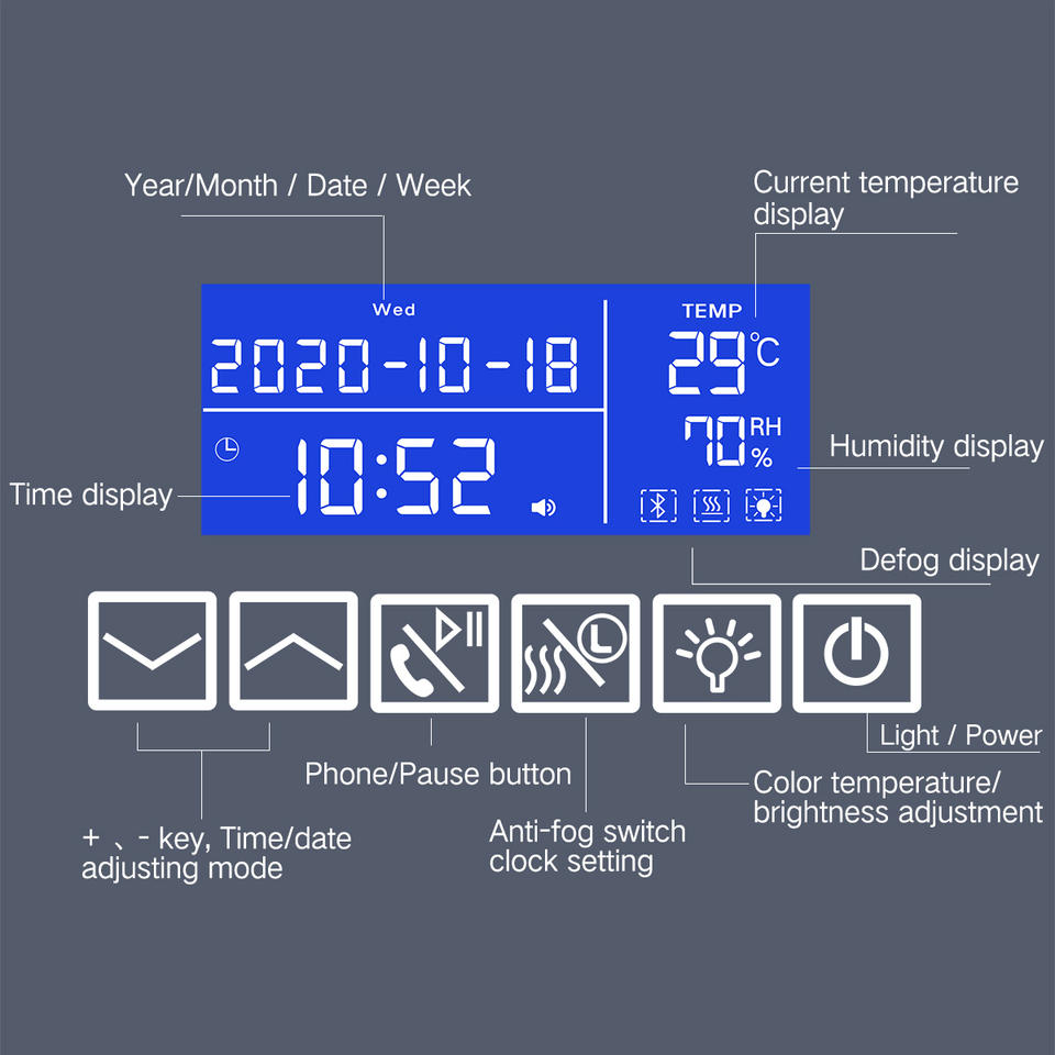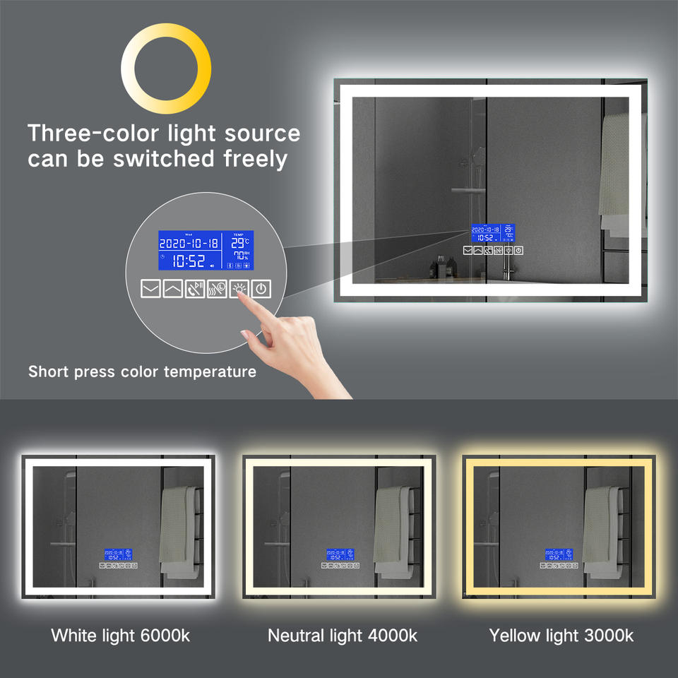 Miroir de salle de bain intelligent en verre trempé LED durable, miroir de salle de bain intelligent étendu avec lumières LED, anti-buée