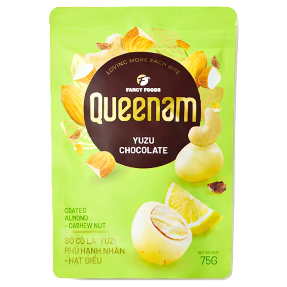 Contenu :Amandes, noix de cajou et macadamias enrobées de chocolat au yuzu
