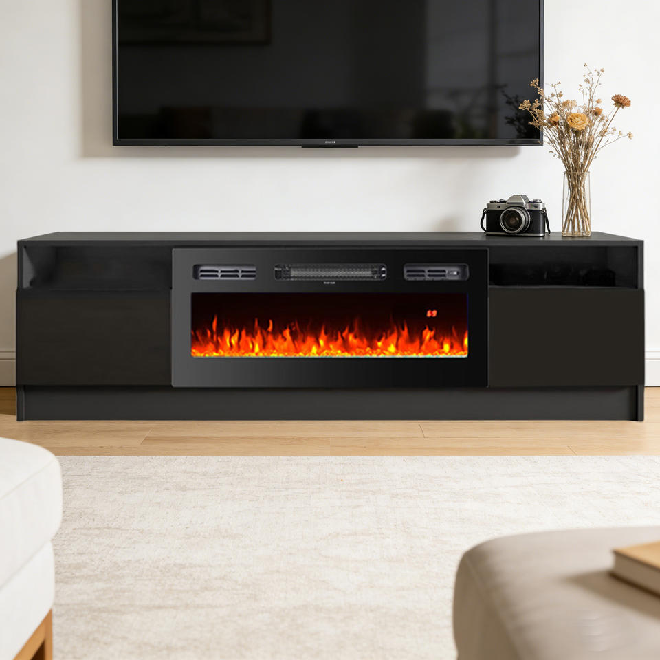 Meuble TV moderne blanc et noir avec cheminée décorative intégrée pour salon - Ventes flash