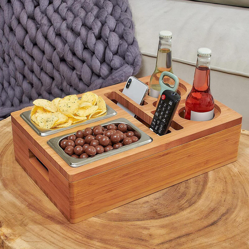 Offres Spéciales couvercle amovible conception porte-boisson pratique pour canapé canapé-lit en bois bambou boisson Snack Caddy canapé plateau