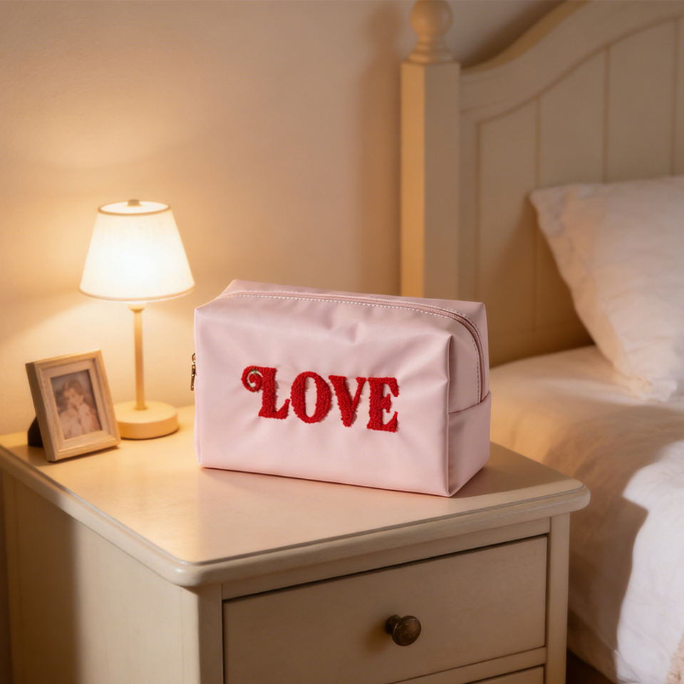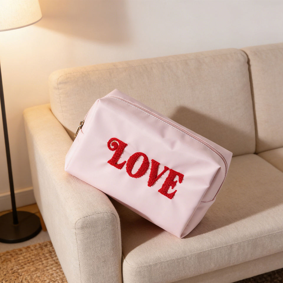 Sac à cosmétiques en nylon personnalisé à la vente, broderie en chenille LOVE, trousse de maquillage avec fermeture éclair
