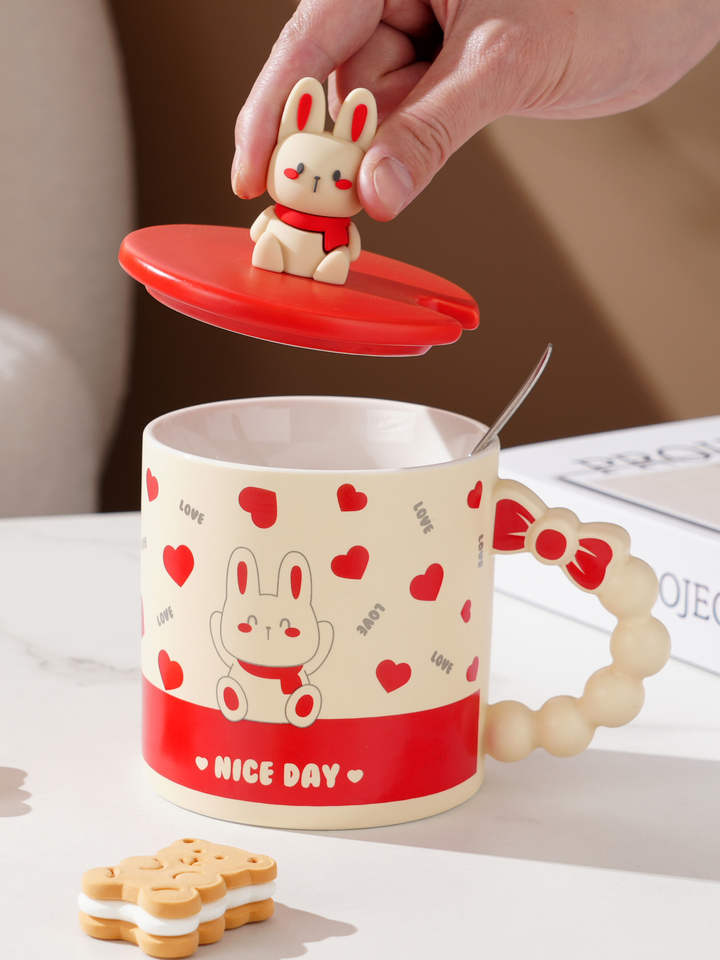 Tasse en céramique personnalisée de 14 oz avec motif lapin mignon, style japonais, avec cuillère et couvercle – Vente chaude
