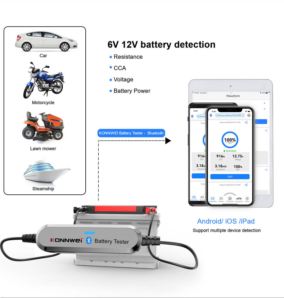 Konnwei – testeur de batterie 12 v, testeur de capacité de batteries bluetooth sans fil 12 volts moniteur de batterie pour voitures