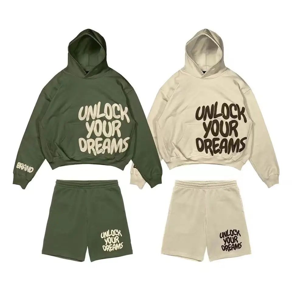 Vente chaude pull à capuche couleur unie 100% coton unisexe à capuche et short à manches longues poche surdimensionné à capuche 2 pièces ensemble short