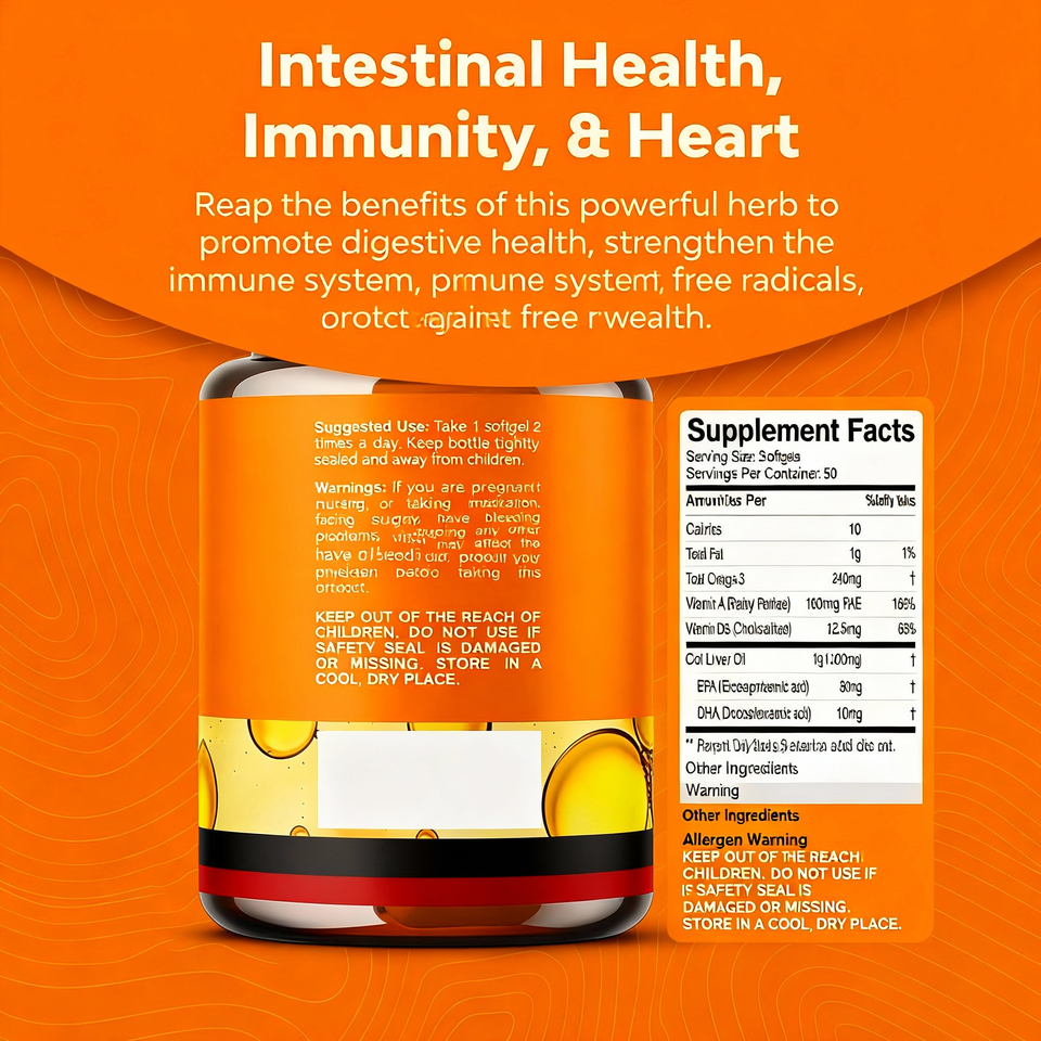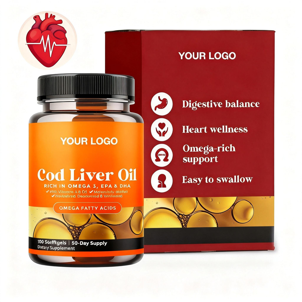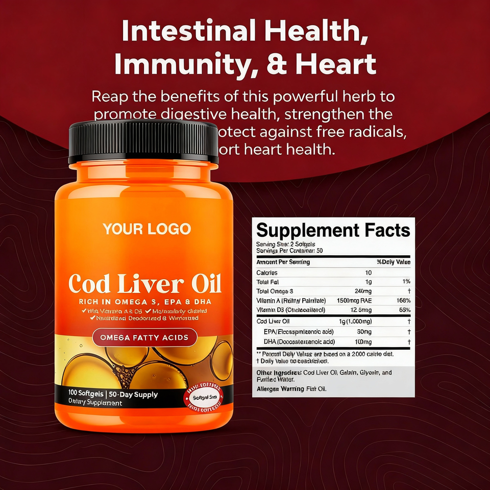 Huile de foie de morue en gélules molles, matière première à forte demande, supplément de vitamines A, D3 et E, 1000 mg
