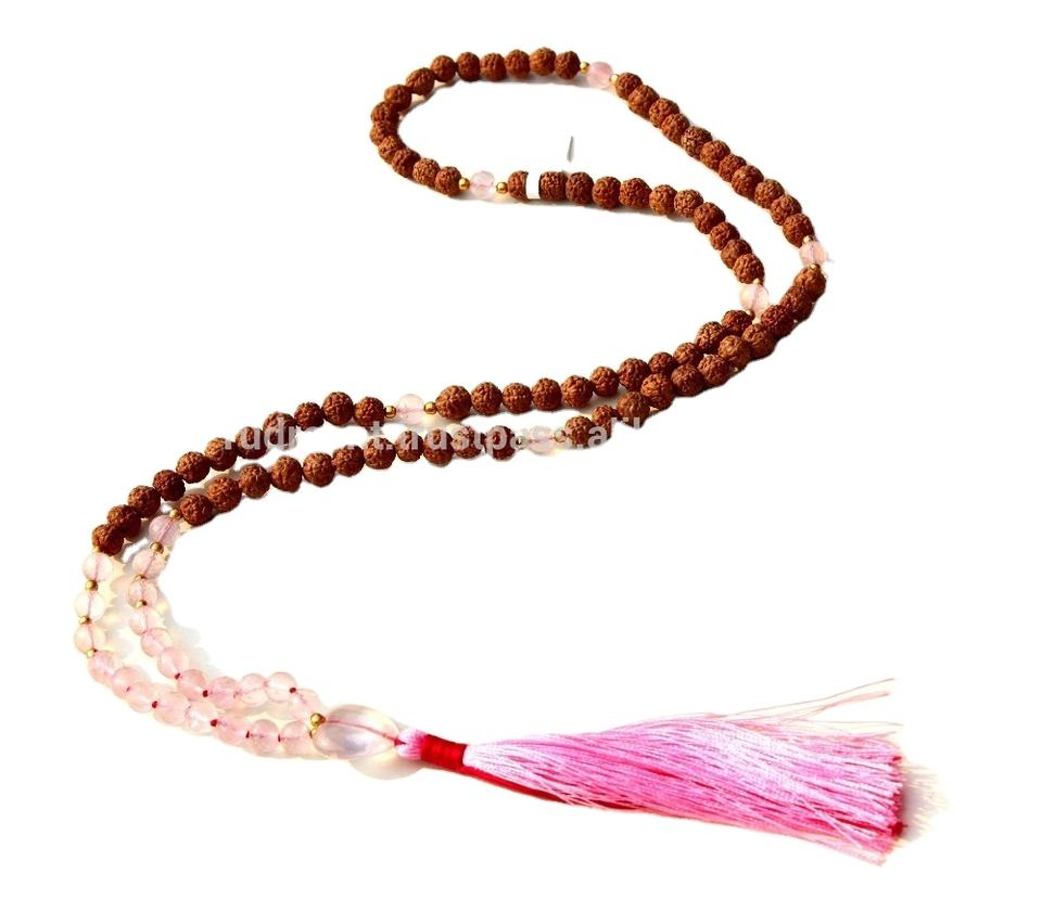 Collier long fait main en pierres précieuses, 108 perles de Mala, Rudraksha, quartz rose, 8 mm, facetté, noué, avec pompon, bijoux en pierres précieuses, troisième