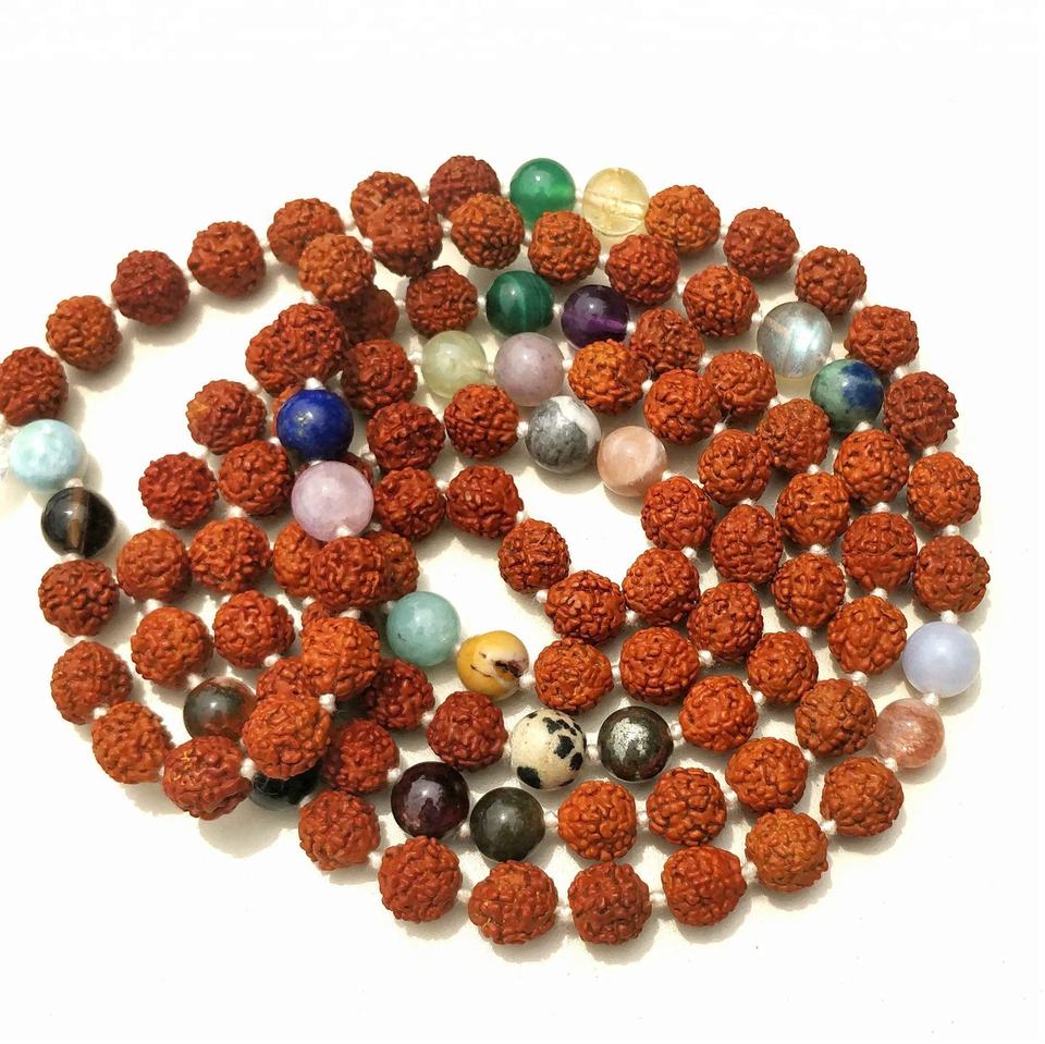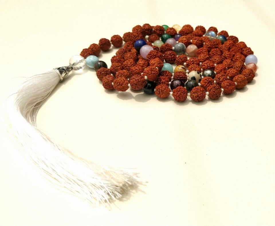 Collier Mala en perles de 8 mm en Rudraksha et pierres précieuses multiples, très vendu, certifié par un tiers, unisexe