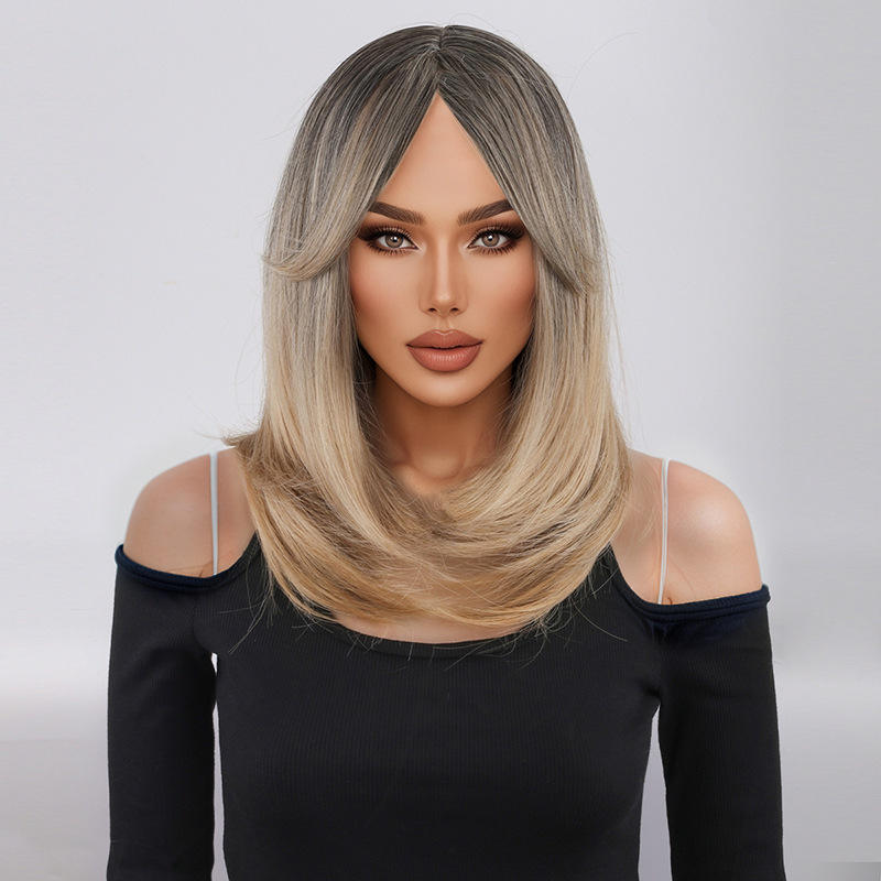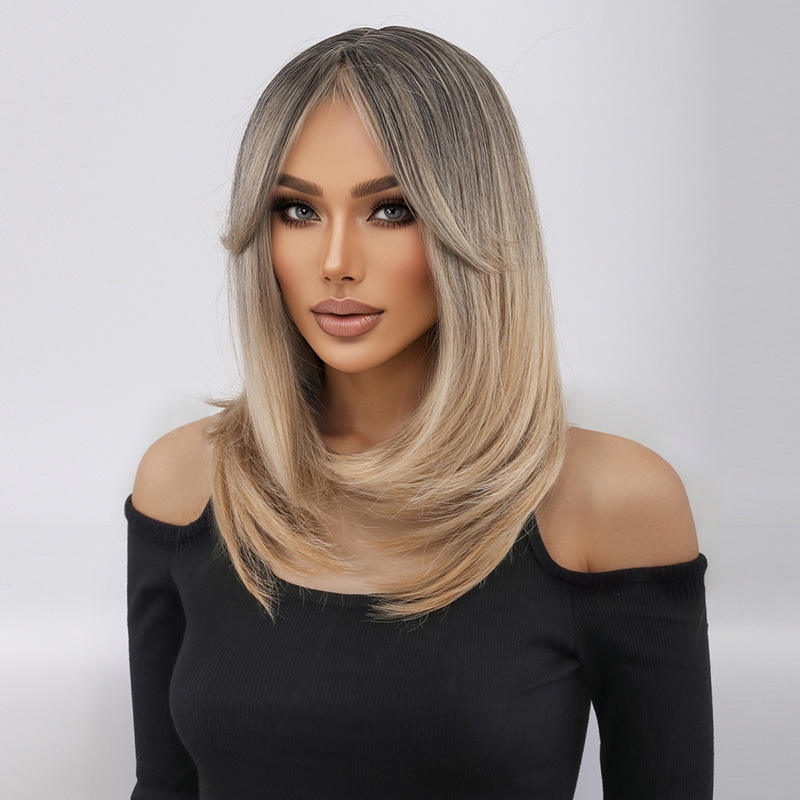 Perruque longue et droite de 18 pouces, couleurs dorées dégradées, avec frange rideau, pour femmes – Meilleure vente