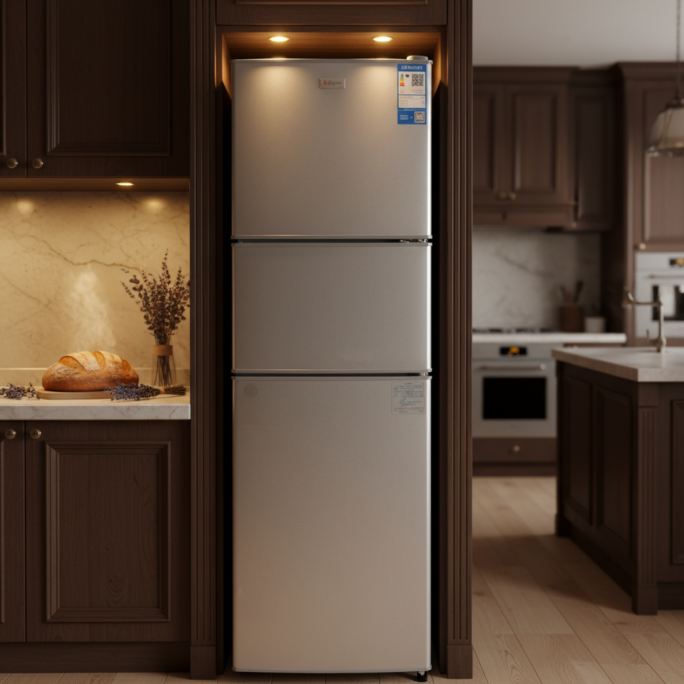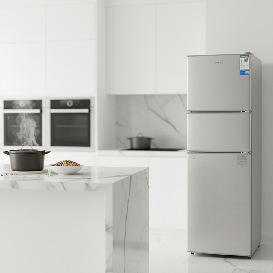 Réfrigérateur 3 portes à congélateur supérieur 206L, modèle très vendu, avec caractéristiques essentielles pour usage domestique