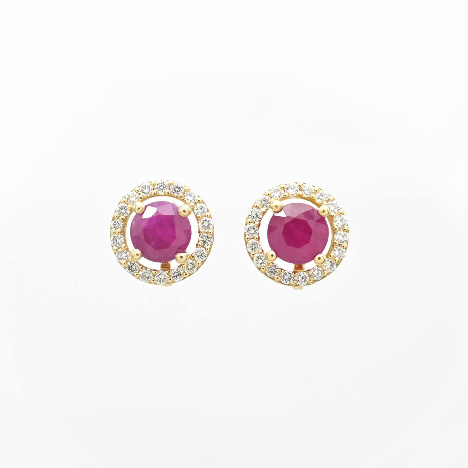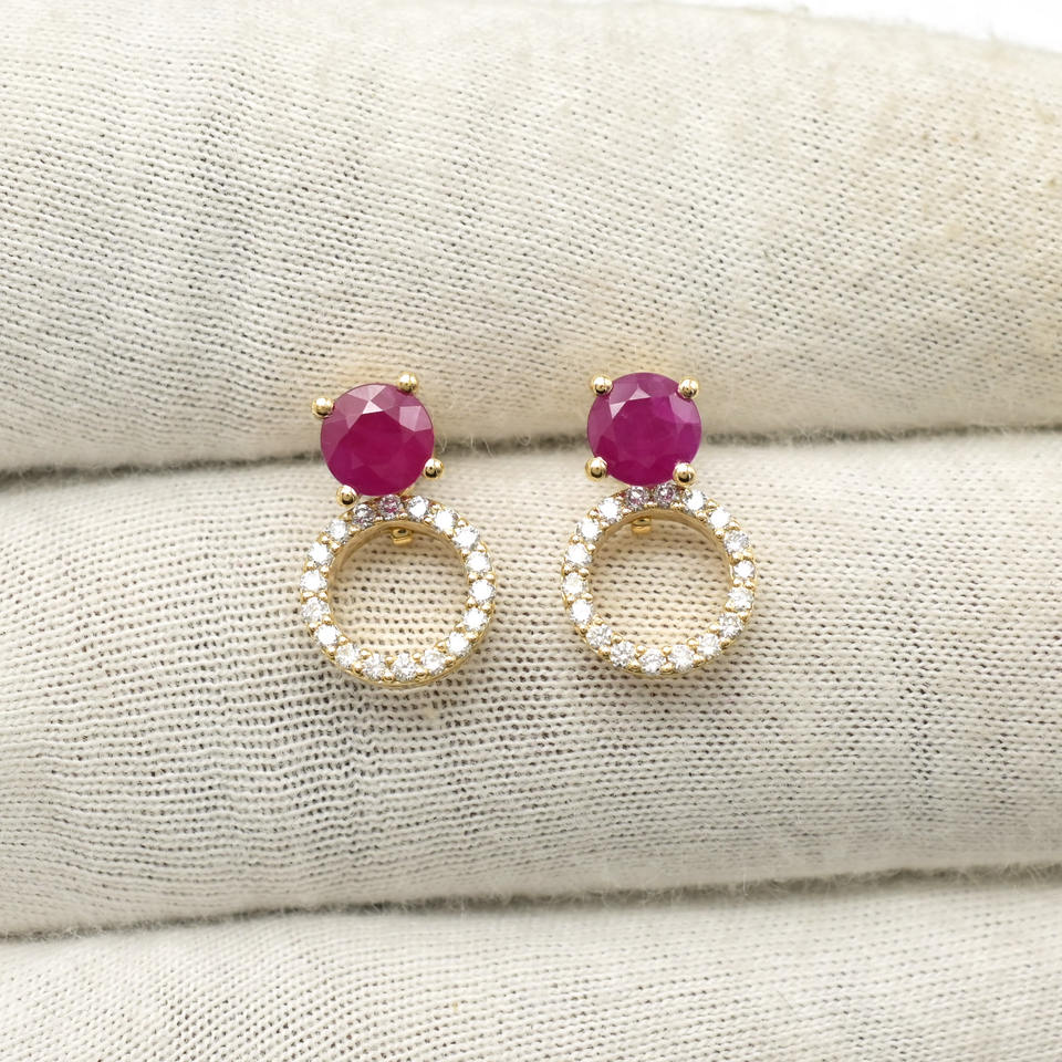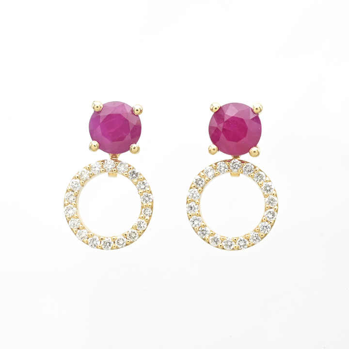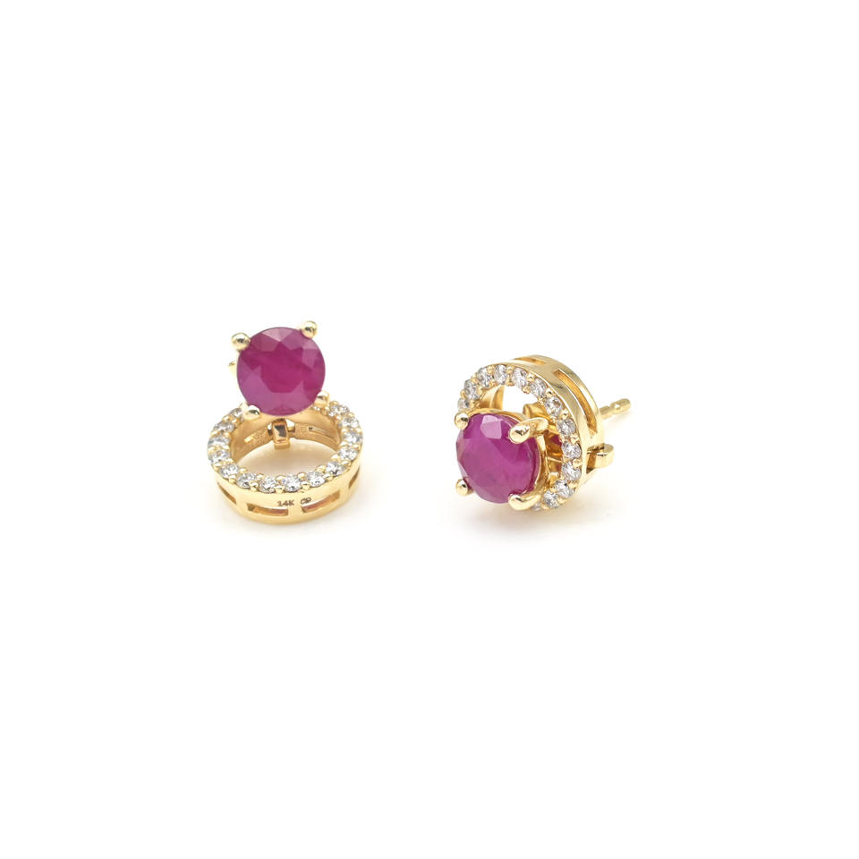 Boucles d'oreilles détachables en rubis rondes de 5 mm, très demandées, avec fermoirs à pression en or jaune 14 carats et diamants, prêtes à être expédiées