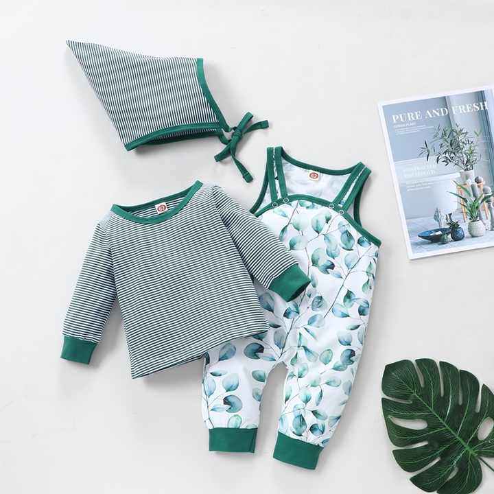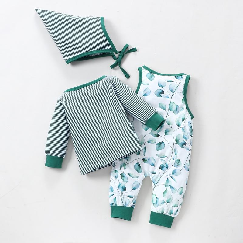 Ensemble de vêtements pour bébé, tenue pour bébé garçon et fille, 3 pièces, hauts à manches longues rayés mignons + barboteuse sans manches à imprimé feuilles + chapeau, 0-18 mois