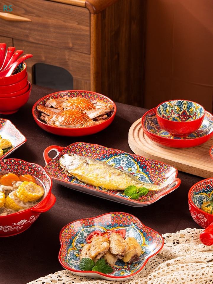 Vaisselle en céramique de Bohème de vente chaude Vaisselle de fleurs rétro Ensembles d'assiettes à dîner colorées exquises