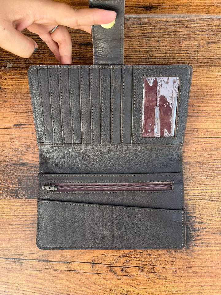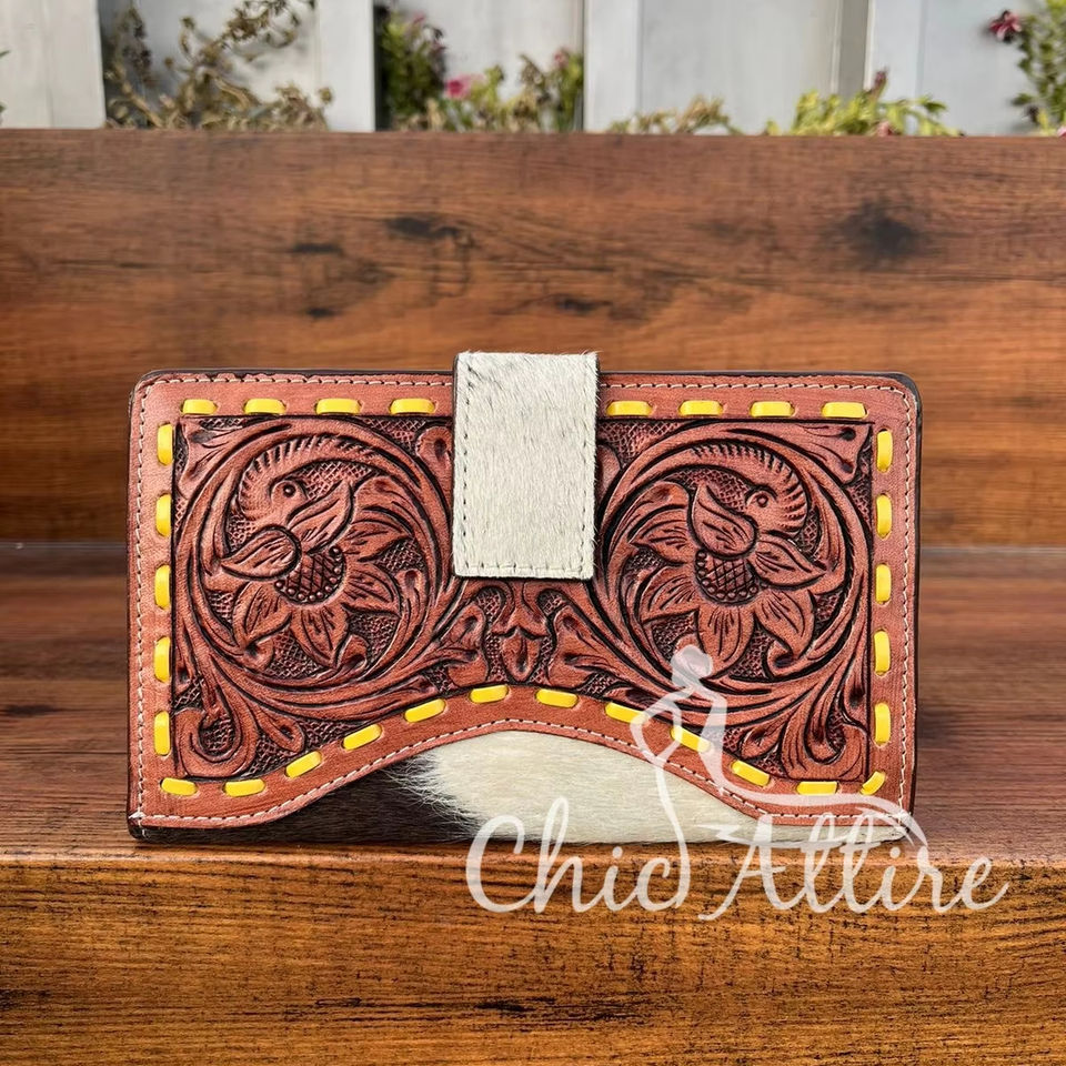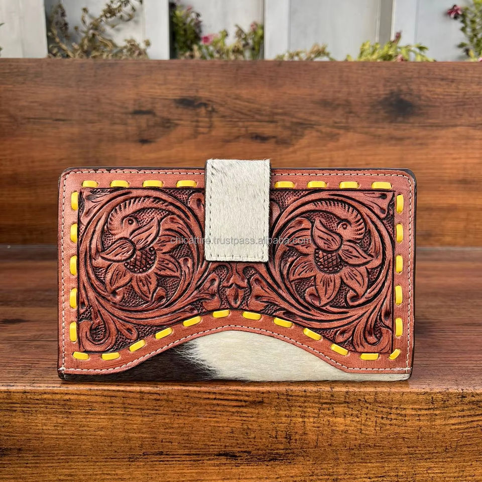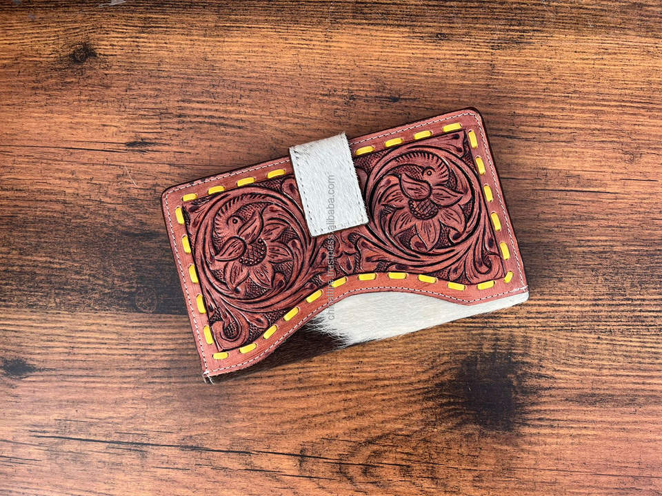 Hot Selling Carving Hand Tooled Wallet Clutch Stylish Genuine Leather Cowhide Fur Wallet Multi Uses Western Leather Wallets