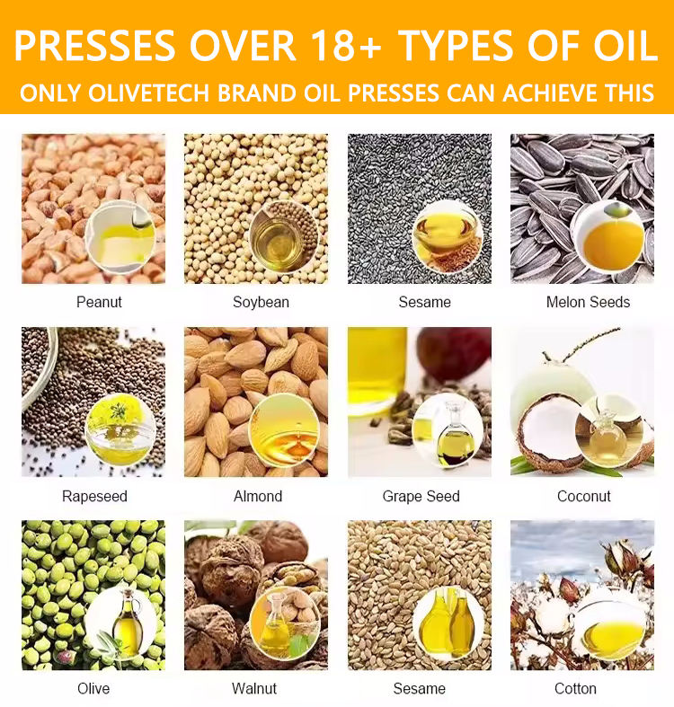 huile de graine d'asphalte, Huile de soja, Rap d'huile de graine, Huile de graines de thé, Huile de basilic, Huile de sésame, D'huile de noix de pin, Huile de graines de tournesol, Almond oil, Huile de noix, Huile d'arachide, Huile de noix de coco, Huile d'olive, Huile de palme, Huile de colza, Huile de moutarde, Huile d'avocat, Huile de germe de maïs, Huile de graines de carthame, Huile de noix de coco de Vierge, Huile d'arachide, Huile de coton, Huile de graines de citrouille, Huile de germe de blé, Machine froide de presse d'huileType d'huile