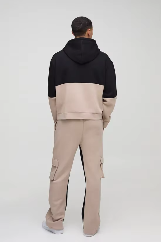 Sweat à capuche color block tendance pour homme, personnalisable OEM, style streetwear, noir et beige bicolore, 100% coton