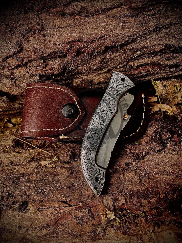 Couteau de poche pliant à lame en acier D2 fait main personnalisé de vente chaude avec manche en acier inoxydable gravé à la main et gaine en cuir
