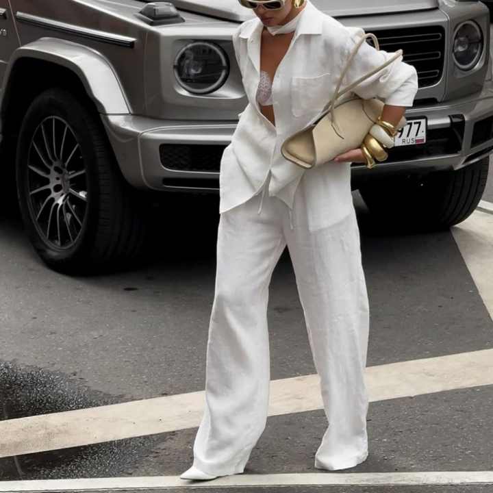 Ensemble deux pièces en lin léger et respirant pour femme, couleur unie, avec logo personnalisé, idéal pour l'été – Chemise et pantalon