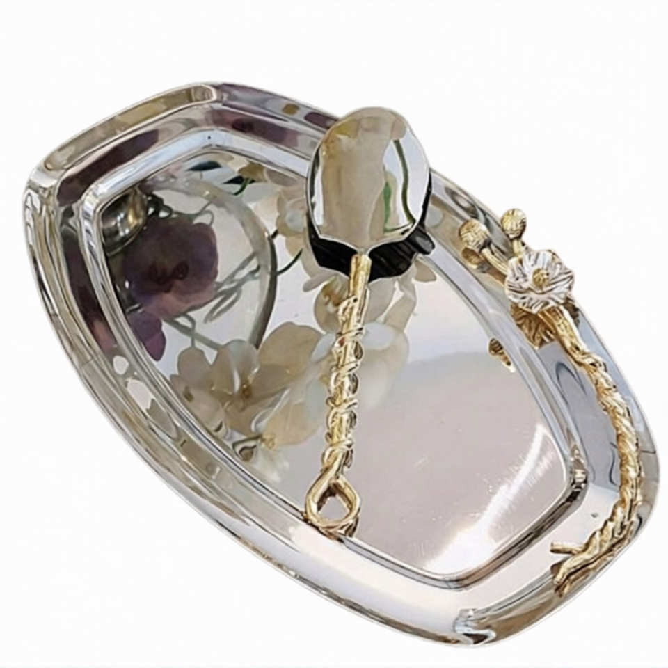 Plateau de buffet décoratif géométrique en métal, plateau miroir ovale avec poignée dorée - pour servir avec style créatif