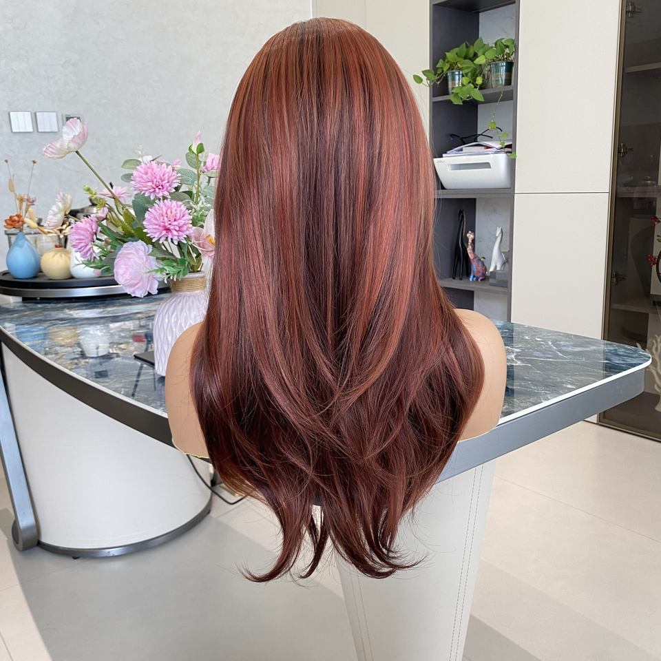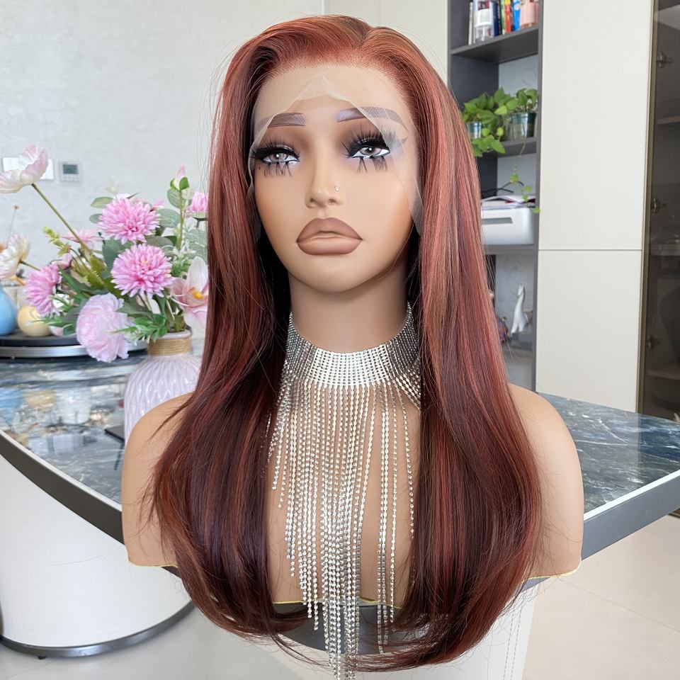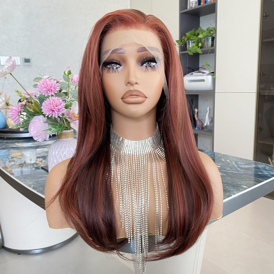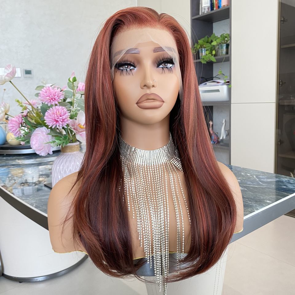 Perruque synthétique sans colle à dentelle frontale, résistante à la chaleur, transparente rouge cuivre, mi-longue, à couches, prix usine, vente chaude