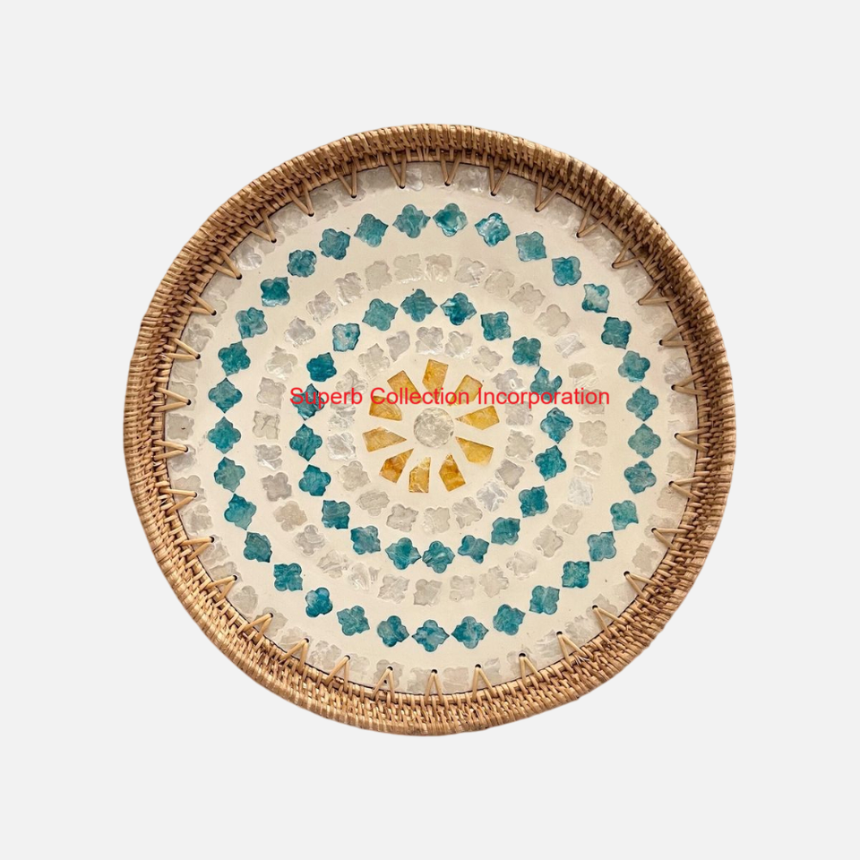 Plateau de service en rotin rond de qualité supérieure avec incrustation de nacre plateau de rangement en osier décoratif pour la décoration intérieure