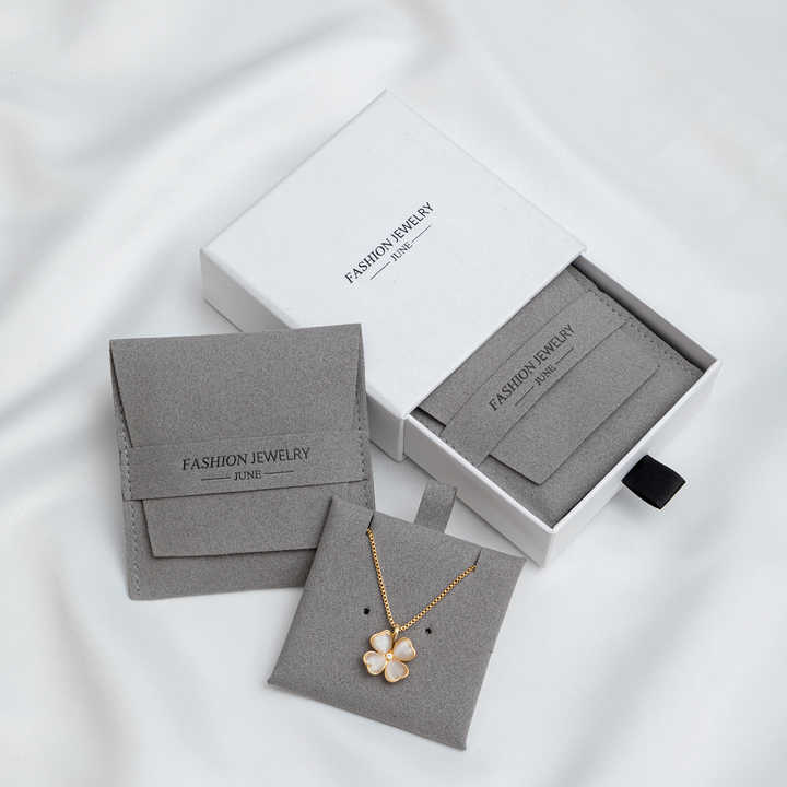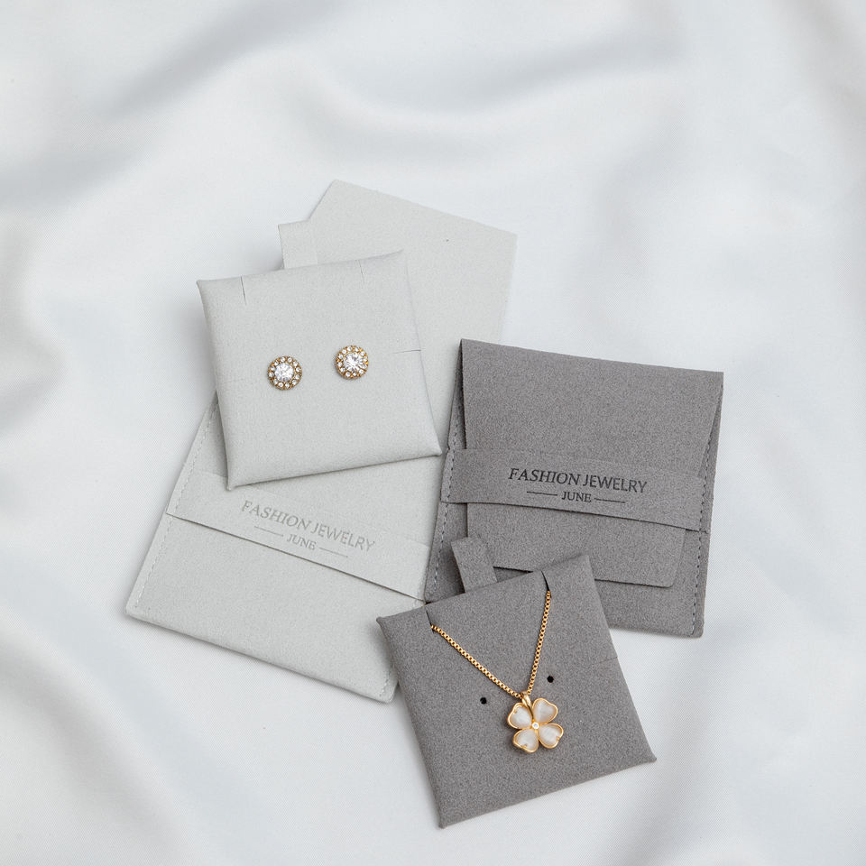 Paquet de bijoux personnalisé en microfibre grise de vente chaude pour boucle d'oreille, bracelet, collier, pendentif, boîte à bijoux et tampon d'insertion avec bûche