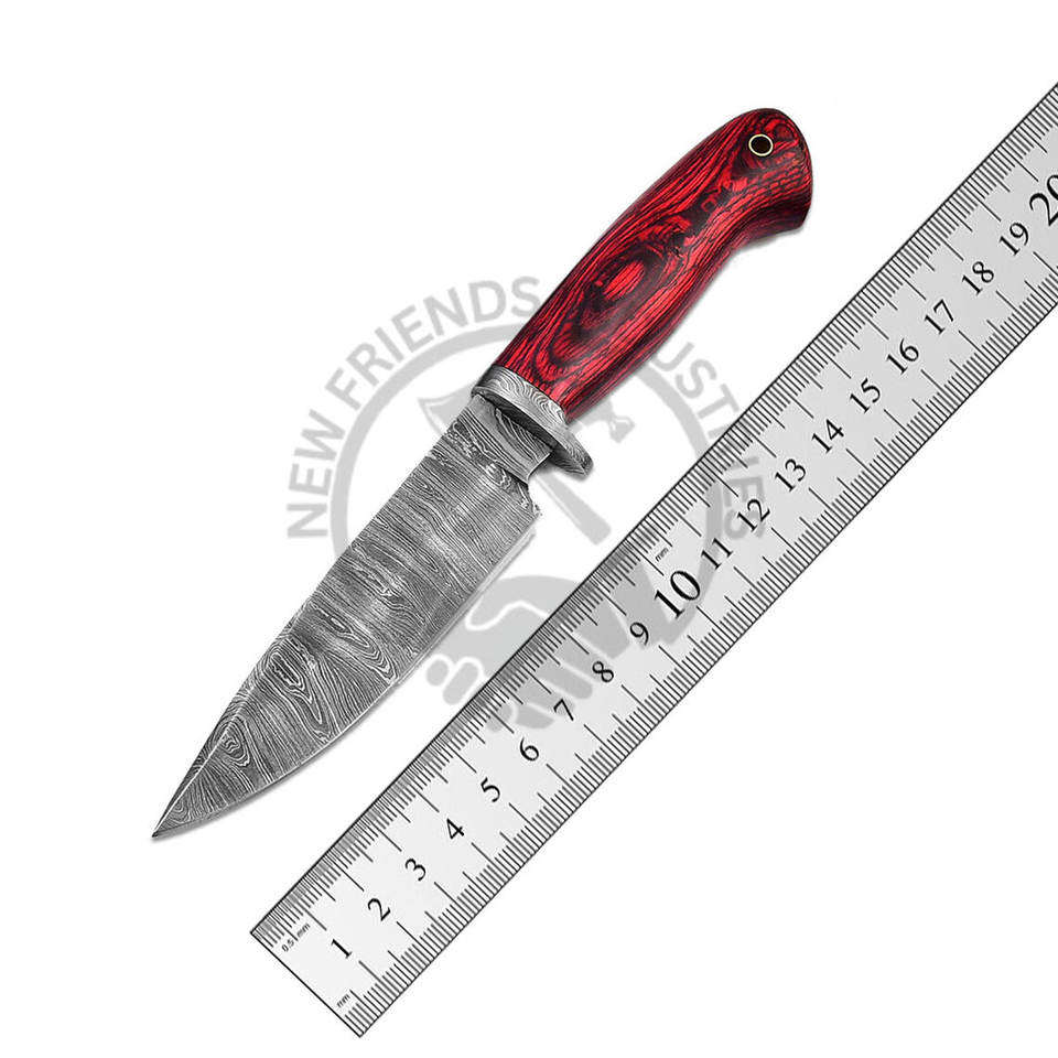 Vente chaude forgé à la main de haute qualité en acier damas lame fixe chasse en plein air Camping couteau bricolage rouge Pakkawood poignée en cuir