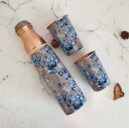 Bouteille d'eau en cuivre avec verre, fabriquée à la main, originale, dernière conception avec émail imprimé, ensemble de 2