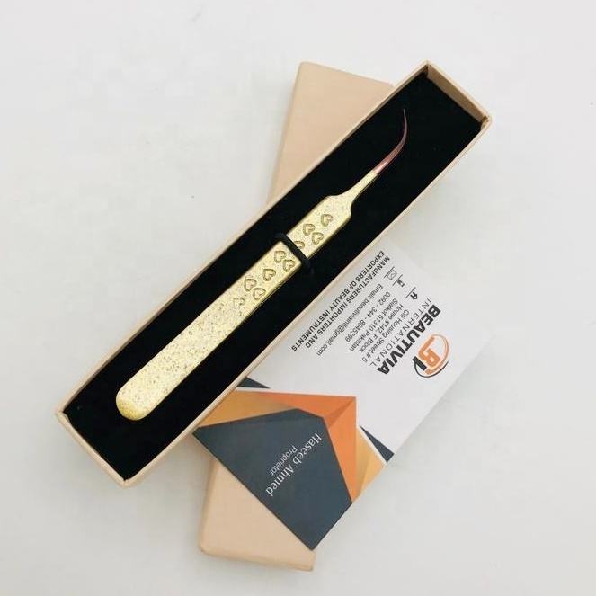 Pince à épiler d'extension de cils avec logo personnalisé en acier inoxydable japonais avec impression de coeur solide incurvée et pointe pointue