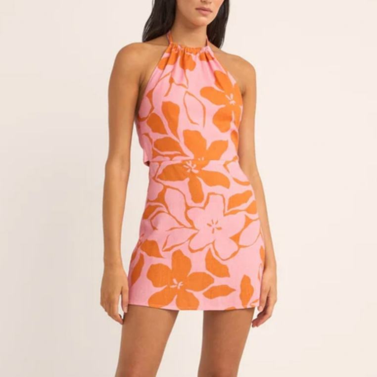 Robe de plage à col halter à imprimé hawaïen de haute qualité, vente chaude, design OEM, 100% lin, robe décontractée courte