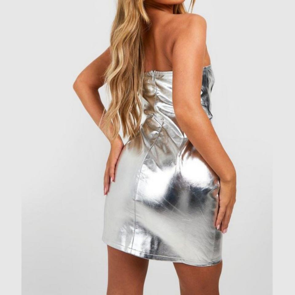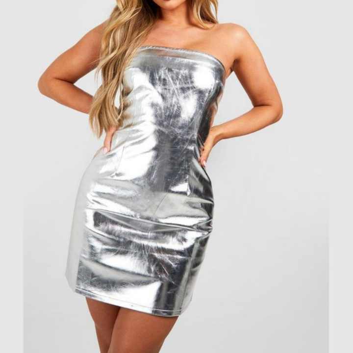 Robe mini moulante argentée métallisée sans bretelles avec fermetures éclair, brillante, pour usage quotidien – Nouvelle collection très prisée