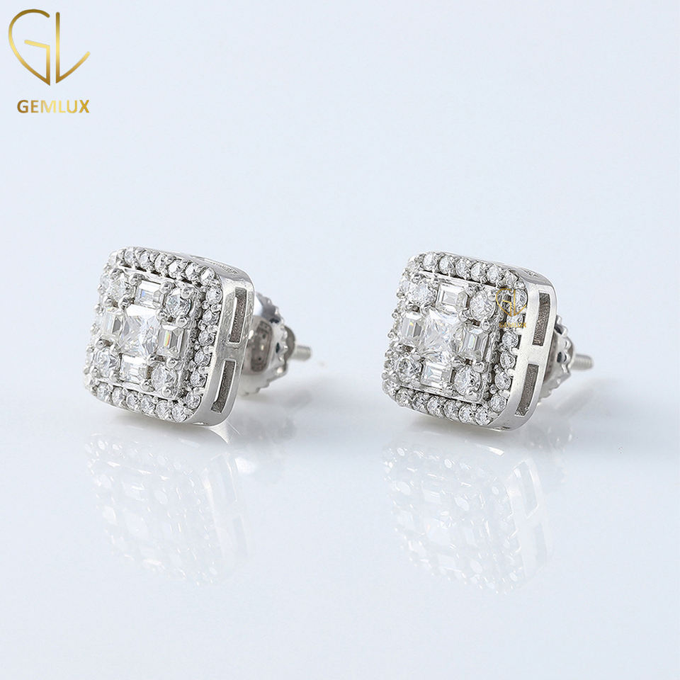 Vente chaude Iced Out Princess Cut Moissanite Diamond Stud Ring, Boucles d'oreilles Moissanite carrées coupe fantaisie, Boucles d'oreilles en or massif 14K