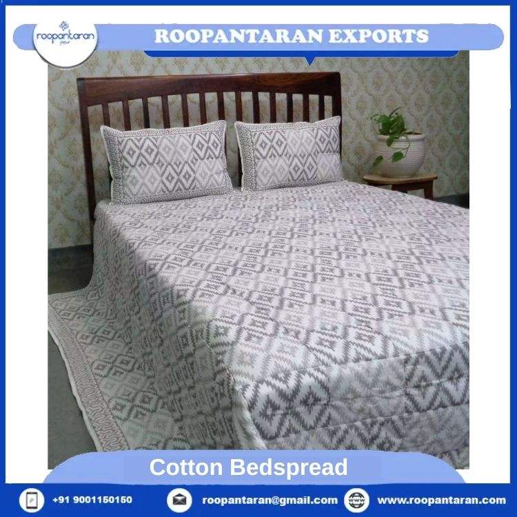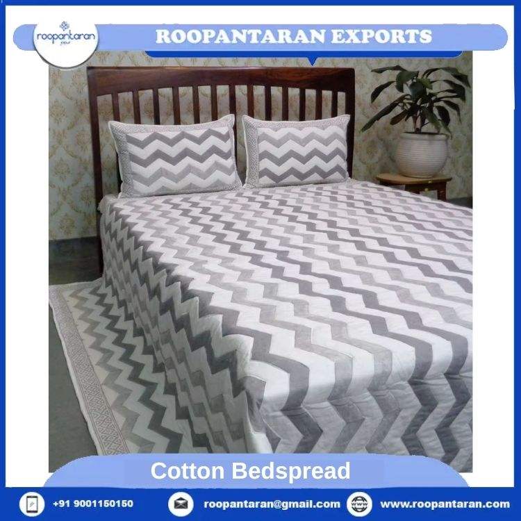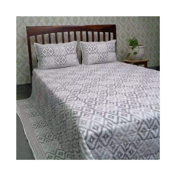 Hot Selling 100% Organic Cotton Bed Spread White with Grey Floral Print GOTS Certified Manufactured in India for Home Use